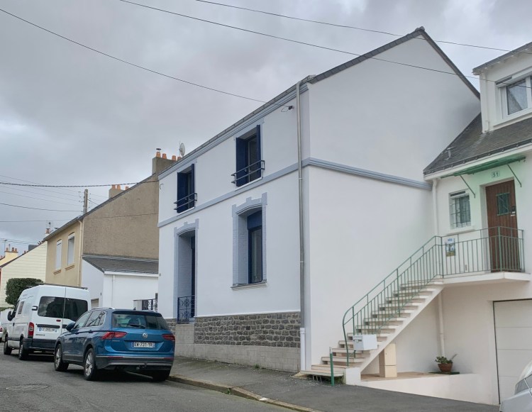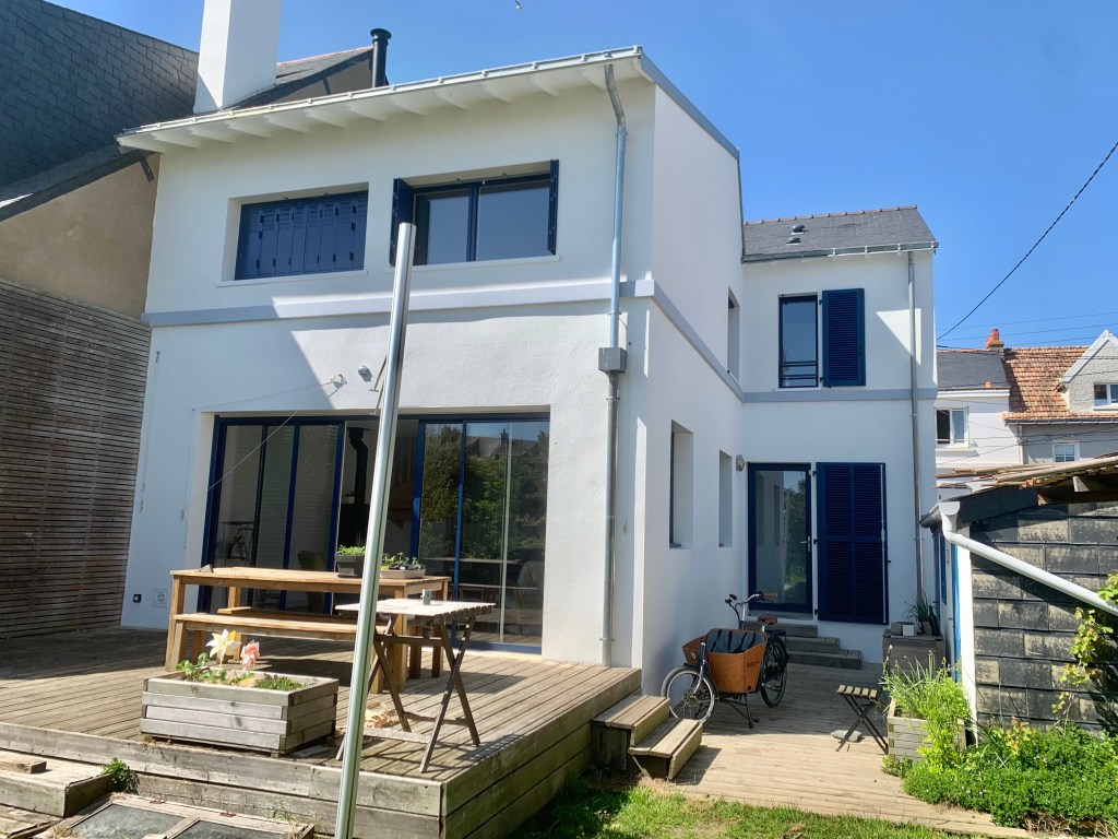 Dans le coeur de Saint Nazaire, surélévation d’une maison d’habitation de deux époques, 1920 et 2005, en ossature bois. Surélévation du comble existant sur la partie ancienne et création de l’étage supplémentaire sur l’extension récente en créant les nouvelles toitures avant démolition des anciennes toitures pour préserver le RDC conservé.